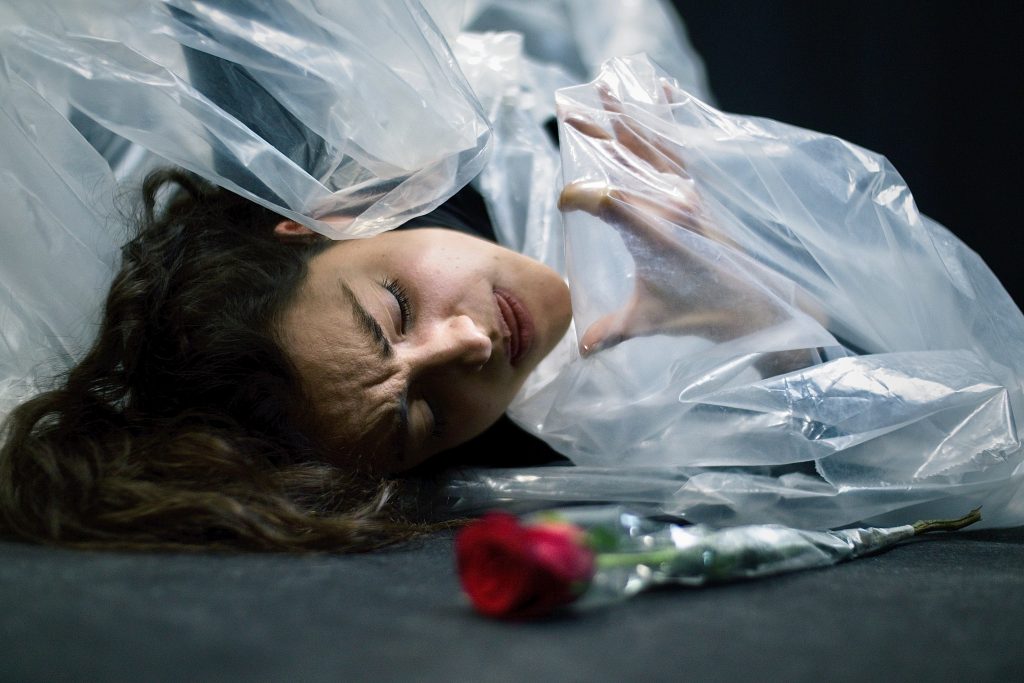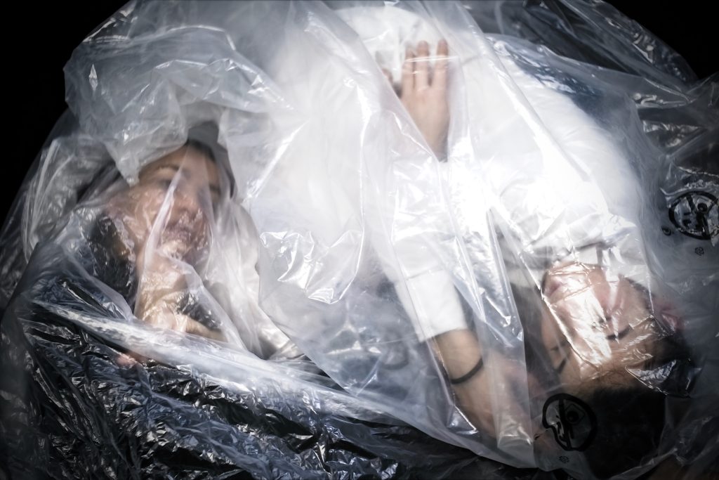 La session photographique ci-présente est inspirée des objets que l’on trouve surplastifiés. La comparaison poético-allégorique de l’humain et de la rose coincée dans un film en plastique démontre le paradoxe dans lequel on se trouve à l’heure actuelle.