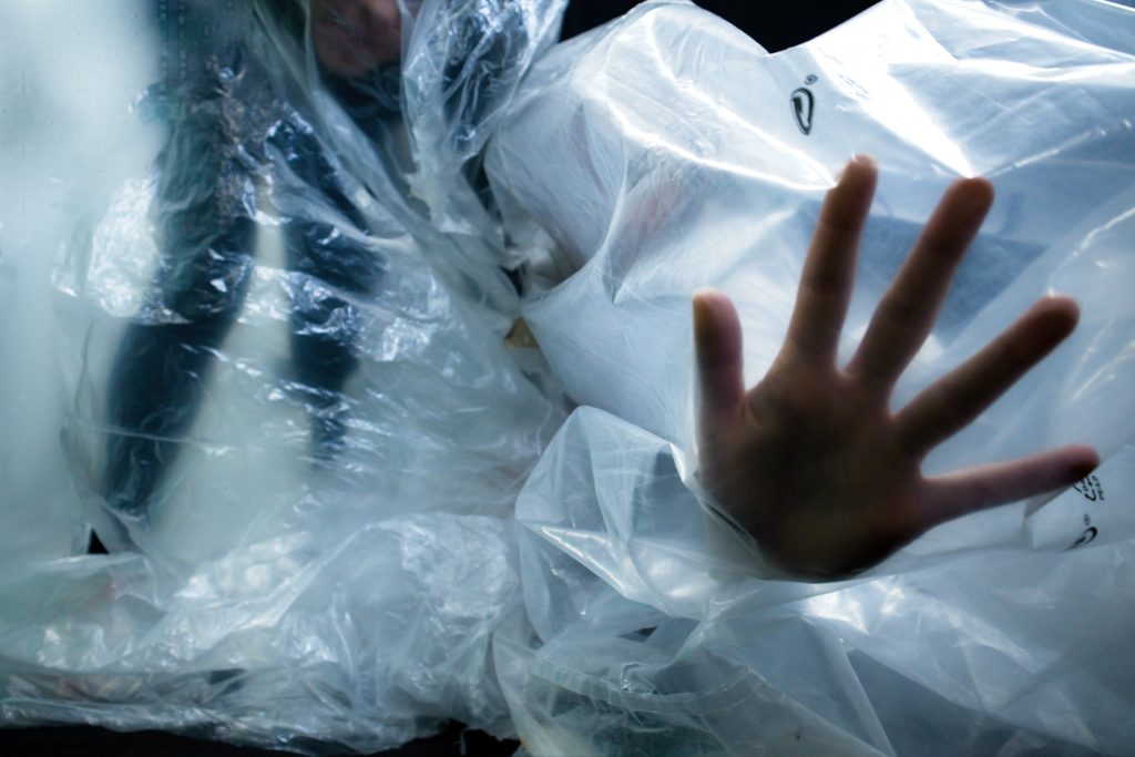 L’humain en gants en plastique, l’humain masqué avec le bout de tissu en fibre de plastique, les humains qui s’embrassent à travers une toile en plastique pour des raisons sanitaires. L’humain qui met les vêtements en plastique, l’humain objet…